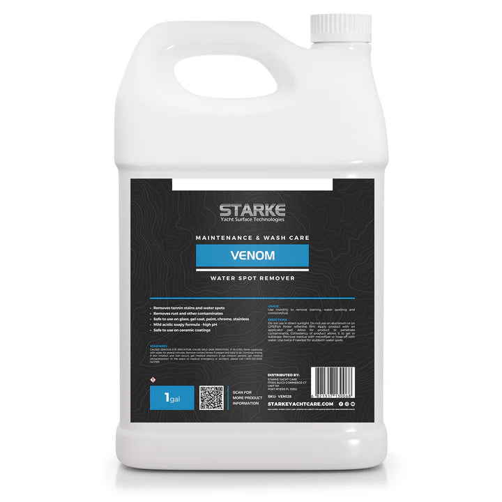 Venom is a new generation water spot remover that is safe to use on finishes that have been ceramic coated. In addition, it is also safe to use glass, paint, gel coat, and metal. The formula has a consistency that allows it to gel to the substrate where it then starts to lightly eat away at minerals and other contaminants.